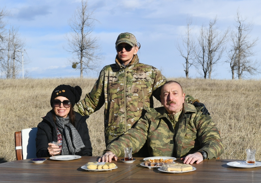 President Ilham Aliyev, first lady Mehriban Aliyeva and their daughter Leyla Aliyeva were invited to a tea table on Jidir Duzu.