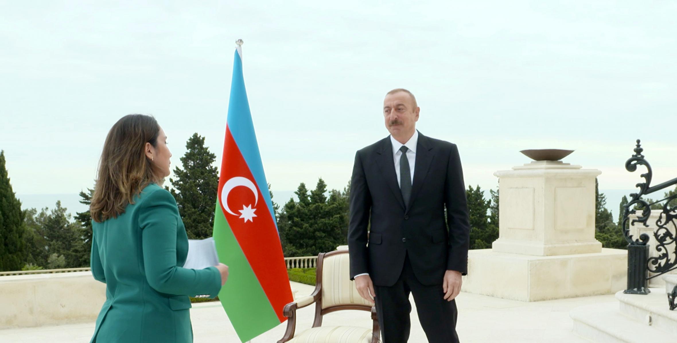 President Ilham Aliyev: Actually, it was Armenian prime minister who put precondition to us. And that, by the way is another provocation. I think several months ago he put seven preconditions to Azerbaijan. Actually, he wanted to dictate his agenda to us and to the Minsk Group. And one of those preconditions was that Azerbaijan should negotiate with the so-called “Nagorno-Karabakh authorities”. And not only we but also Minsk Group rejected it. Because it changes completely the format of negotiations, which was elaborated for more than twenty years. And negotiations are taking place between Armenia and Azerbaijan. So, he put precondition to us and we rejected it. And the reason why he did it, was again he wanted negotiations to stop and keep the status quo unchanged. As far as we are concerned, we are always ready for negotiations. We never rejected it, we had difficult times in negotiation process in previous years. Not everything was going smoothly. But, with the previous Armenian leaders we had a process. We were elaborating step by step approach. Otherwise, we wouldn’t have been in this process for so many years. It was not useless time. I think we have made very big progress. I am in this process since 2003, and I worked with two previous Armenian presidents and we made progress. It was not easy, we had, of course, a big variety of use but we were making step by step progress and we elaborated what we have now. After Pashinyan came to power, he not only destroyed everything before him but wanted to pretend that Armenia before him did not exist and he is now the creator of new Armenia and he destroyed all the elaborated principles. Therefore, full responsibility is on him and his government. By the way, reasonable people in Armenia understand it. They were already making statements alarming Armenian population that this person leads their country to catastrophe. It is not a way how to behave on negotiations, it is not a way how to provoke Azerbaijan. Another provocation was the so-called inauguration of the so-called leader of “Nagorno-Karabakh” in the ancient Azerbaijani city of Shusha. No other so-called “Nagorno-Karabakh leader” did that. Why he did it. In order to insult the feelings of Azerbaijanis. Then, they decided to move the so-called parliament of “Nagorno-Karabakh” from Khankandi to Shusha. Why? Another insult on Azerbaijanis. They openly resettle Armenians from Lebanon to the occupied territories, demonstrate it on TV which is a brutal violation of Geneva Convention, in order to demonstrate their hatred to us. Everything what he did was to destroy negotiation process. Therefore, now when they are pleading for negotiations, when Pashinyan calls world leaders many times and is complaining about Azerbaijan, I think those leaders should tell him ‘it was you who destroyed negotiations. it was you who provoked Azerbaijan, it was you who insulted the feelings of Azerbaijanis’. Therefore, you must be responsible for that. And Armenian people and I made an appeal a couple of days ago to Armenian people. They should make him responsible for that. We don’t have a problem with Armenian people, they are our citizens, we have thousands Armenians living in Azerbaijan, and those who live in Nagorno-Karabakh area, we also consider them our citizens. And we invite them to live together with us as many other nationalities and ethnicities who live in Azerbaijan. Therefore, Armenia should refrain completely from these provocative statements. They should make new statements that Karabakh is not Armenia, and then we will see.